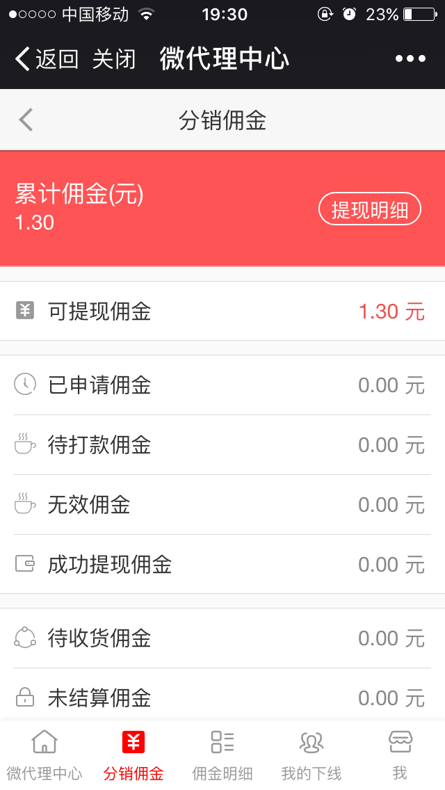 傭金管理支持按照分類查看傭金審核:待審核、待打款、已打款、無效提現(xiàn)等;支持分銷商查看傭金總額及明細